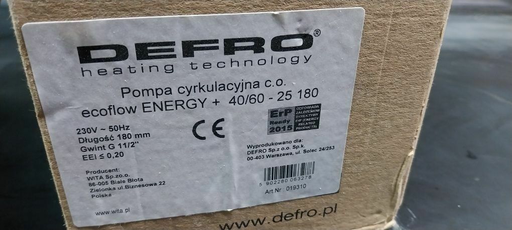 Pompa cyrkulacyjna DEFRO ecoflow ENERGY + 40/60 - 25 180 do kotła c.o. o 100% sprawności. Urządzenie posiada certyfikat CE i spełnia wszystkie wymagane normy.W komplecie pudełko orginalne, instrukcja, wtyczka do przewodu, 2 uszczelki. Towar z zapasów magazynowych